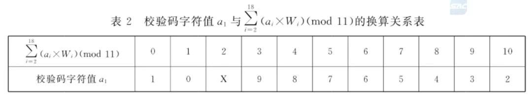 爲了方便計算,國家標準中直接給出了校驗碼a1和餘數的換算關係對應表: