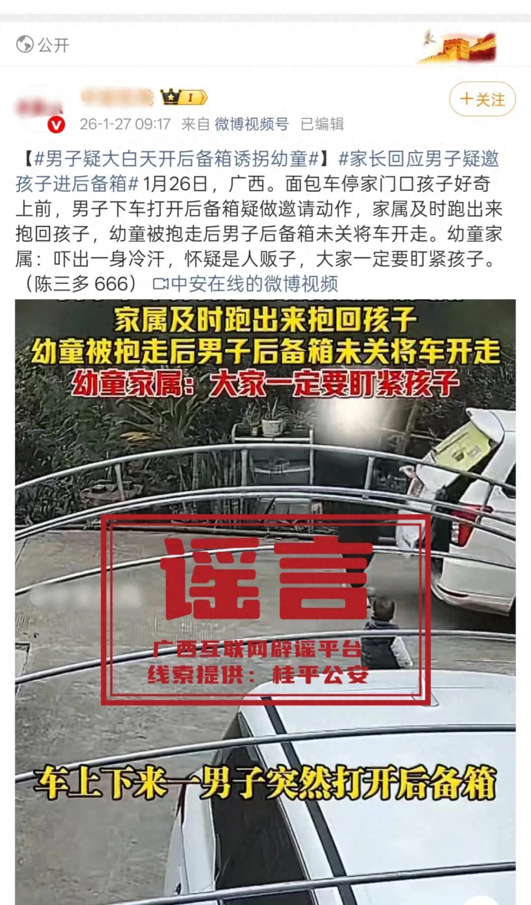 近日,網絡上流傳“桂平一男子疑打開汽車後備箱誘拐兒童”的信息,引發關注。