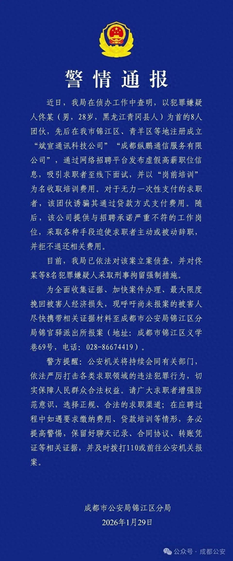 1月29日,成都市公安局錦江區分局發佈一則關於虛假高薪職位招聘的警情通報,提醒廣大求職者在應聘過程中警惕要求繳納費用、貸款培訓等情形,小心“高薪”變陷阱。
