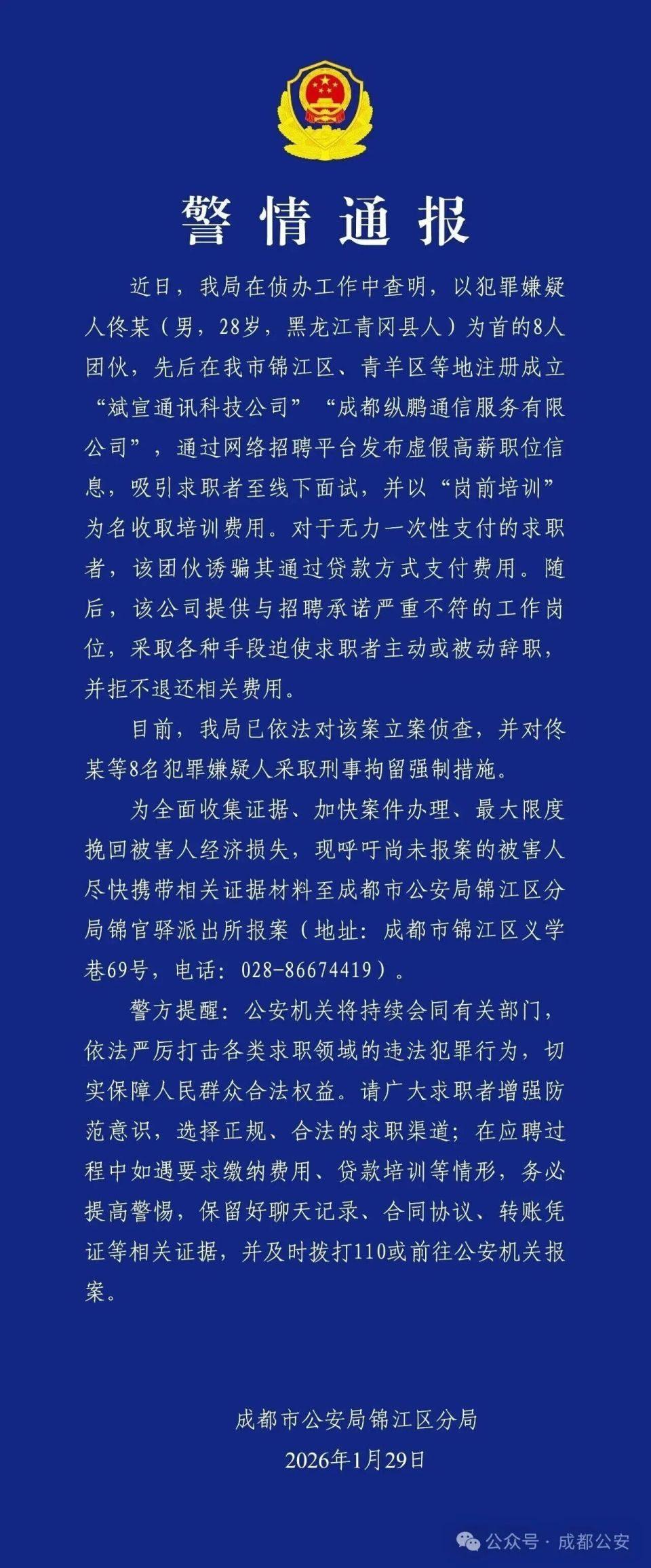 成都警方通報8人招聘爲名誘騙求職者——熊貓斬謠(2026年1月30日)