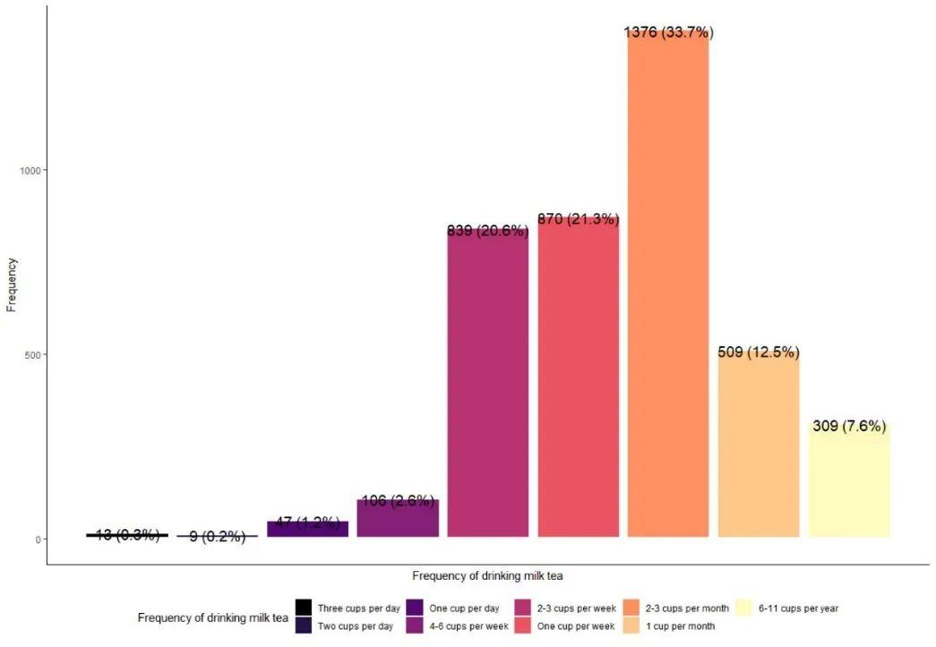 幾乎一半的受訪者表示,他們每週至少喝一杯奶茶。其中,2.6% 的青少年每週喝 4 至 6 杯奶茶,20.6% 的青少年每週喝 2 至 3 杯奶茶。這一發現爲所有人敲響了警鐘,因爲奶茶不僅在中國,而且在全世界都備受歡迎。