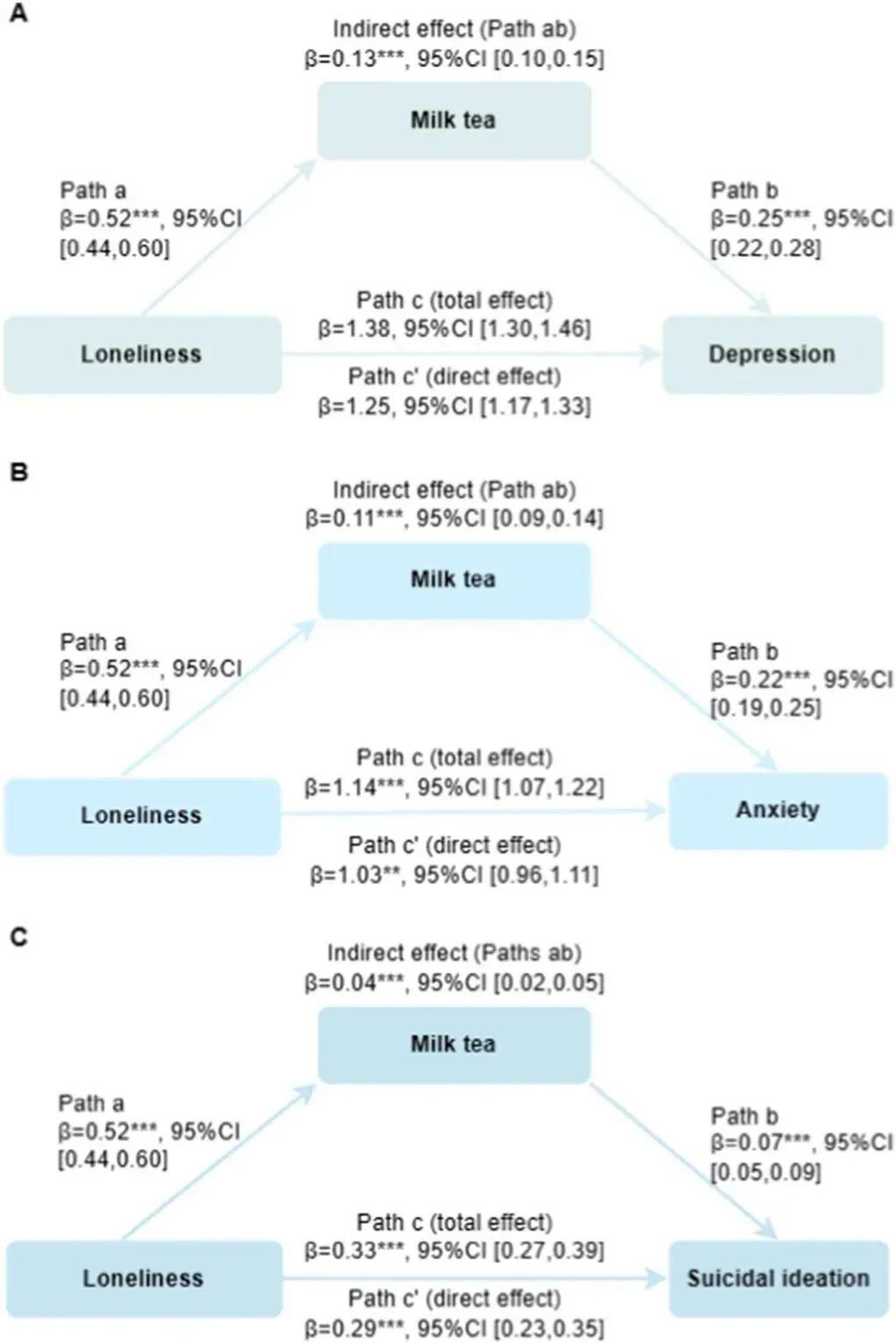 這意味着,孤獨感可能通過增加喝奶茶的頻率,間接提高了抑鬱、焦慮和自殺觀念的風險。這一觀點爲心理健康干預措施提供了一個可能的新方向,即通過減少奶茶成癮來間接改善心理健康。