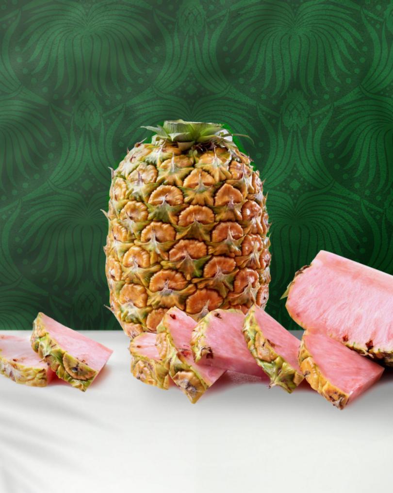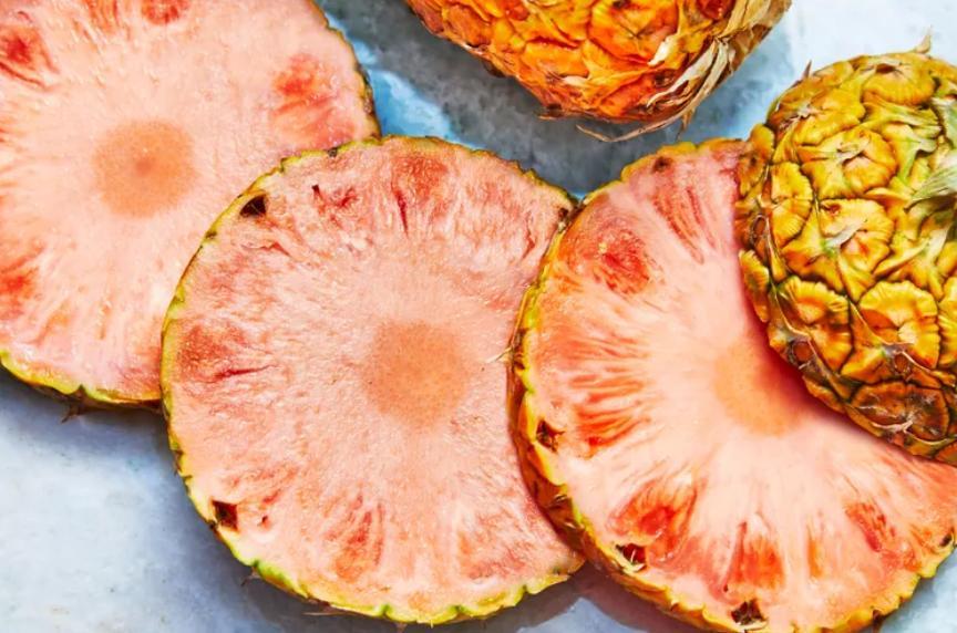 粉菠蘿採用轉基因技術降低了中間轉化酶的水平,在成熟後仍然含有較多的番茄紅素,果肉的顏色就與衆不同了。2016 年,美國食品藥品監督管理局(FDA)認定粉菠蘿可以安全食用並批准上市。