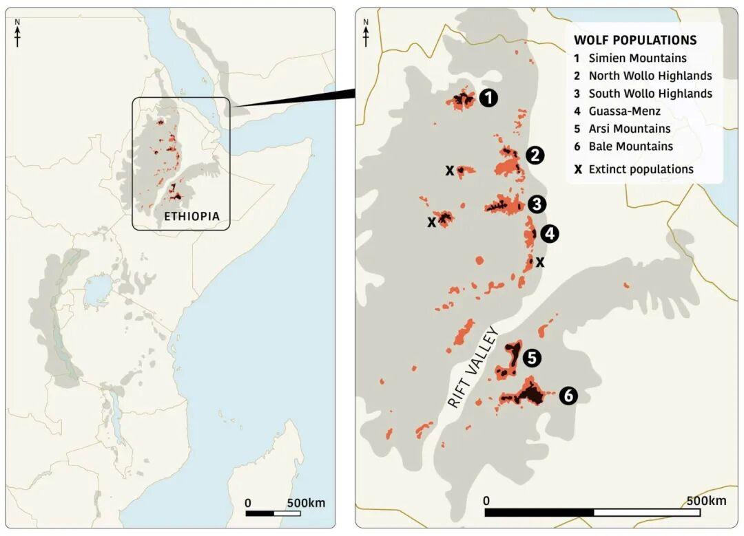 這些狼羣分散在埃塞俄比亞高原上的6個山區棲息地中,彼此隔離。其中半數以上生活在南部的貝爾山國家公園,其餘分佈於塞米恩山等高海拔山系。這些小種羣規模極其脆弱,一些山頭上僅殘存不到25只成年個體,甚至部分區域已經局部滅絕。根據2024年的估計,所有野生種羣加起來大約只有450只狼,由99個狼羣組成。