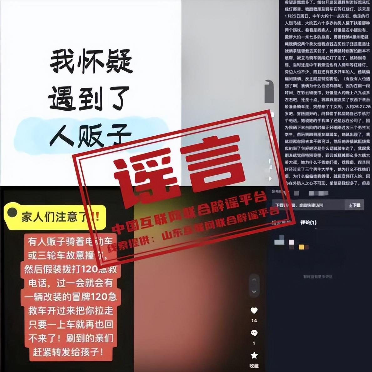 真相:近日,網上多個短視頻平臺有網民發佈“煙臺市某商場有陌生人給他人孩子錄像”“有人販子騎着電動車或三輪車故意撞人,假裝撥打120急救後,冒牌120急救車會把人拉走”等信息,引發輿論關注。經當地公安機關覈實,以上信息均爲不實信息。