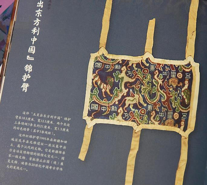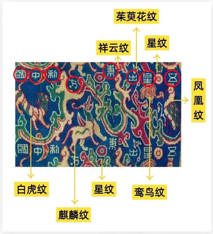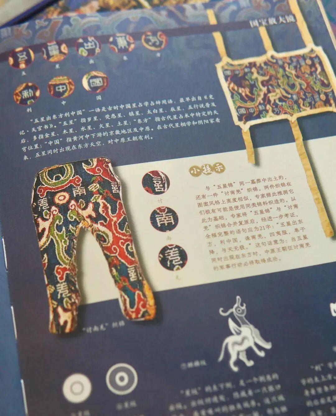原來:在這塊色彩斑斕、織工精細的面料上,赫然可見“五星出東方利中國”八個大字。