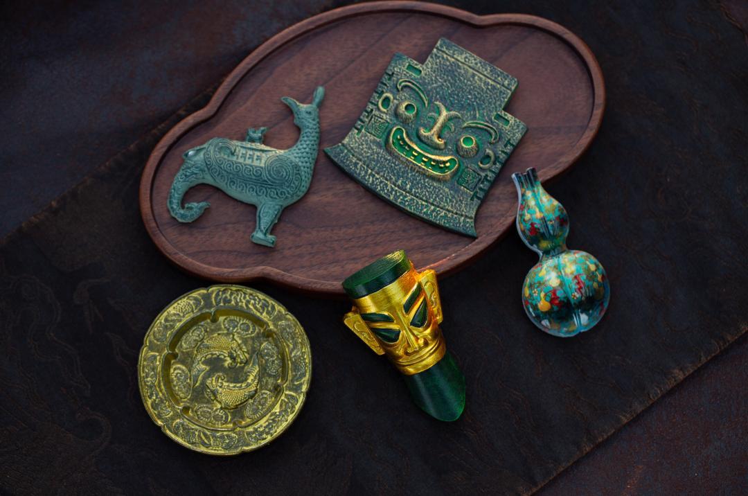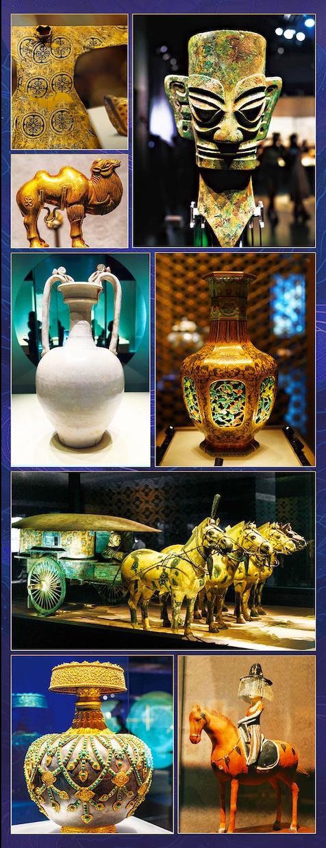 山東博物館:粉彩三孔葫蘆瓶;三星堆博物館:戴金面具青銅人頭像;內蒙古博物院:摩羯戲珠紋金花銀盆。