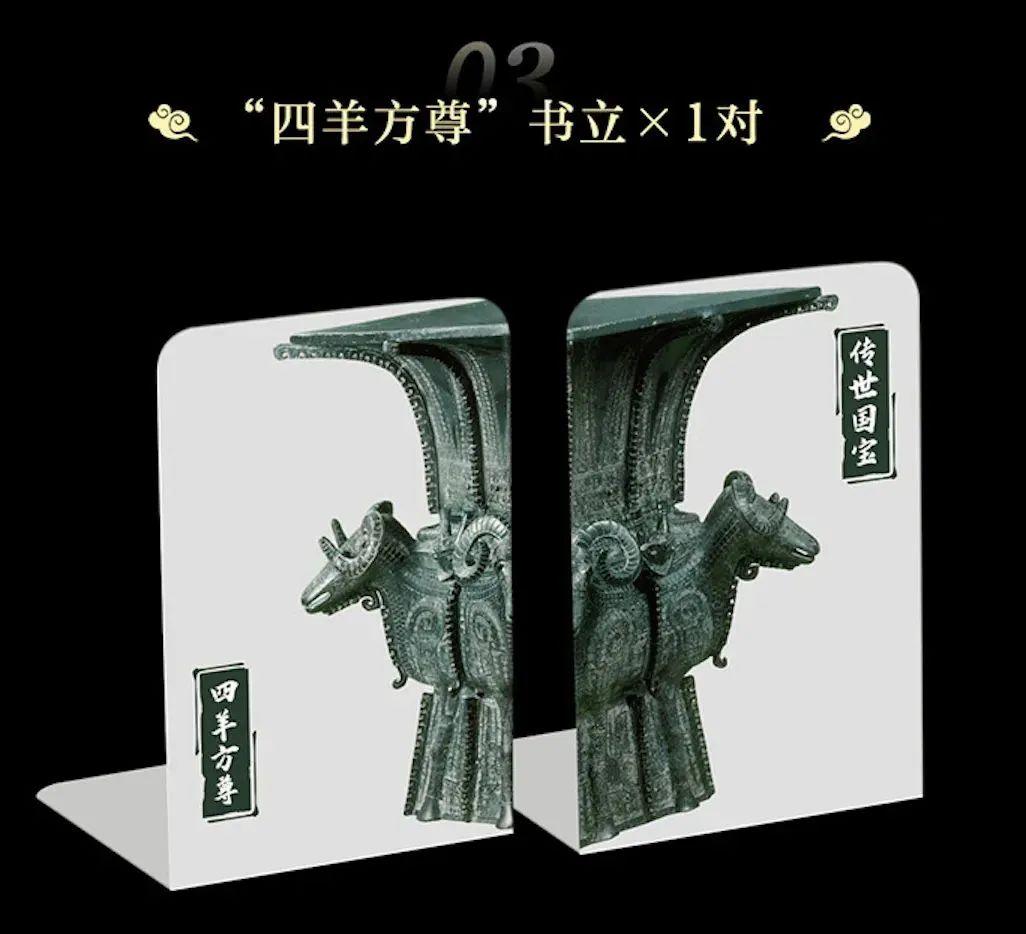 “手繪國寶”藏書票+“鎮館之寶”印章10+四羊方尊精緻書立1對+國寶文物音頻故事100個+定製書盒