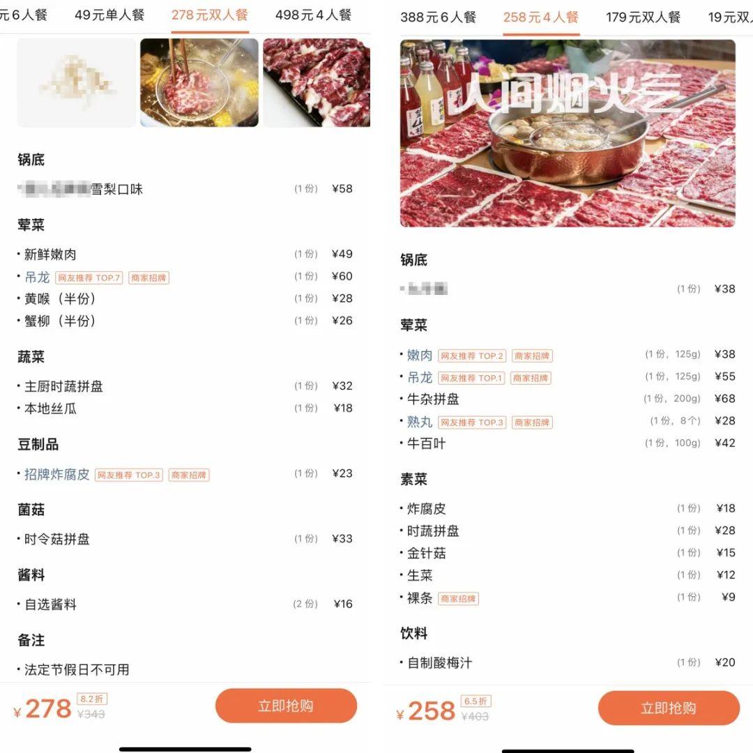 我們對比了某團購平臺的套餐,一般的4人餐,價格都在250元上下,而且每盤牛肉的重量只有125g,根本不夠喫。