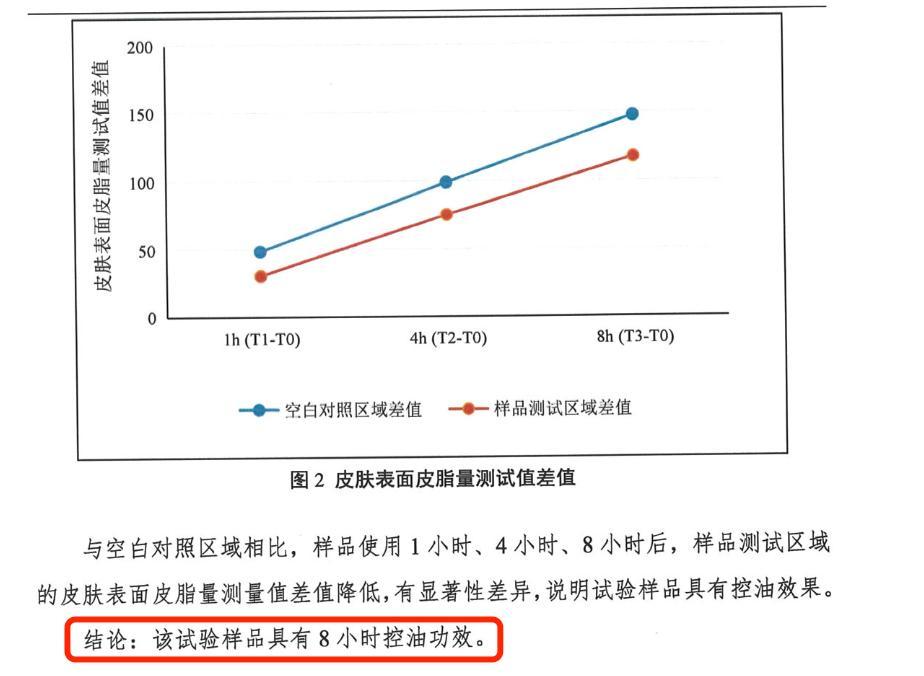 8小時後,樣品測試區域的皮膚表面皮脂量顯著降低