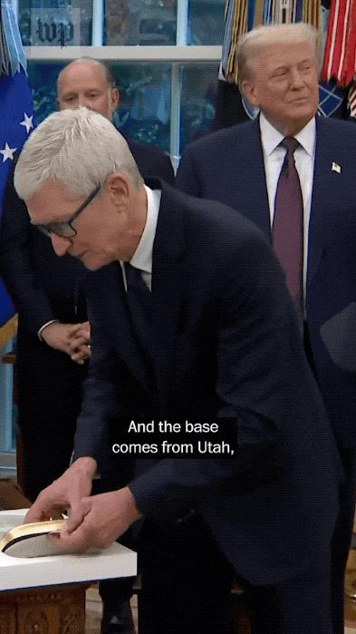 然而,去年庫克在白宮,給特朗普獻上了一個帶有蘋果 logo 的玻璃擺件(玻璃生產於康寧公司在肯塔基州的工廠),鑲嵌在 24K 純金底座上。
