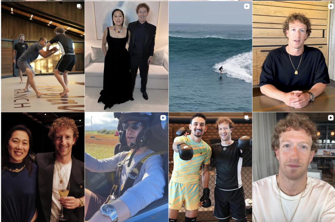 現在的扎克伯格,彷彿換了一個人。他留起了捲髮,脖子上掛着金鍊子,在 Instagram 近一半的內容都是格鬥訓練、被汗水浸透的肌肉、WWE 現場的 VIP 觀戰席。