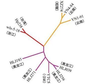 第一是,菌株具有明顯的地理聚集性,呈現出“地緣越相近、基因越相似”的分佈模式。有研究對10株不同地域來源的菌株進行了基因組分析,其中4株分離自黑龍江,2株來自雲南,此外山東、浙江、西藏、臺灣地區各1株。結果顯示,黑龍江與山東分離菌株相近,西藏與雲南菌株相近,臺灣與浙江菌株相近(具體見下圖)。
