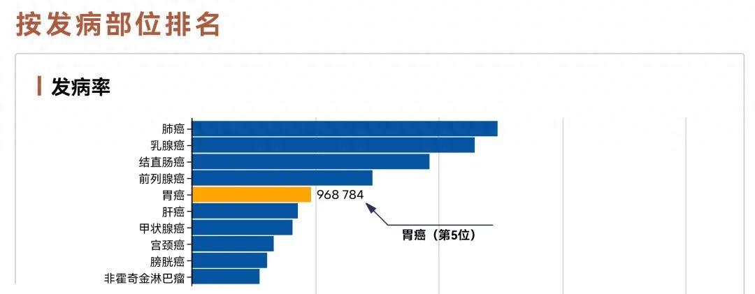 根據國際癌症研究機構(IARC)的數據,2022年全球新增胃癌病例約97萬例,僅次於肺癌、乳腺癌、結直腸癌、前列腺癌,位列第5;死亡約66萬例,僅次於肺癌、結直腸癌、肝癌、乳腺癌,同樣位列第5。