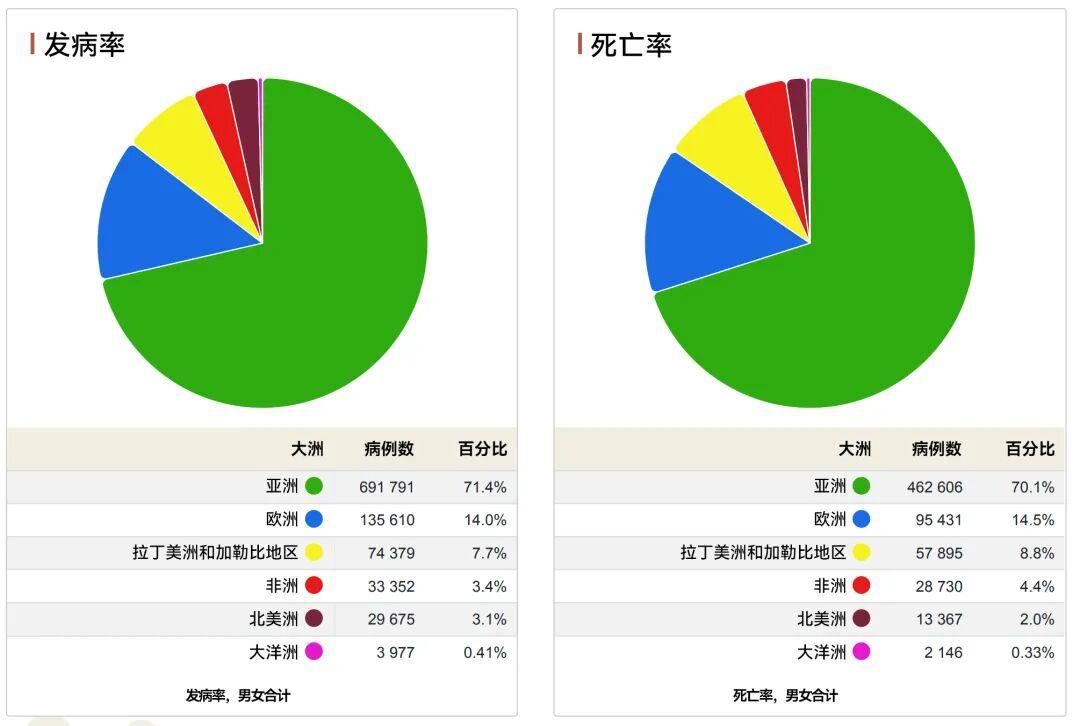但這些發病和死亡並不是按人口比例、均等地分佈在世界各地,亞洲是胃癌的高發區,佔據了71.4%的新發病例和70.1%的死亡病例。