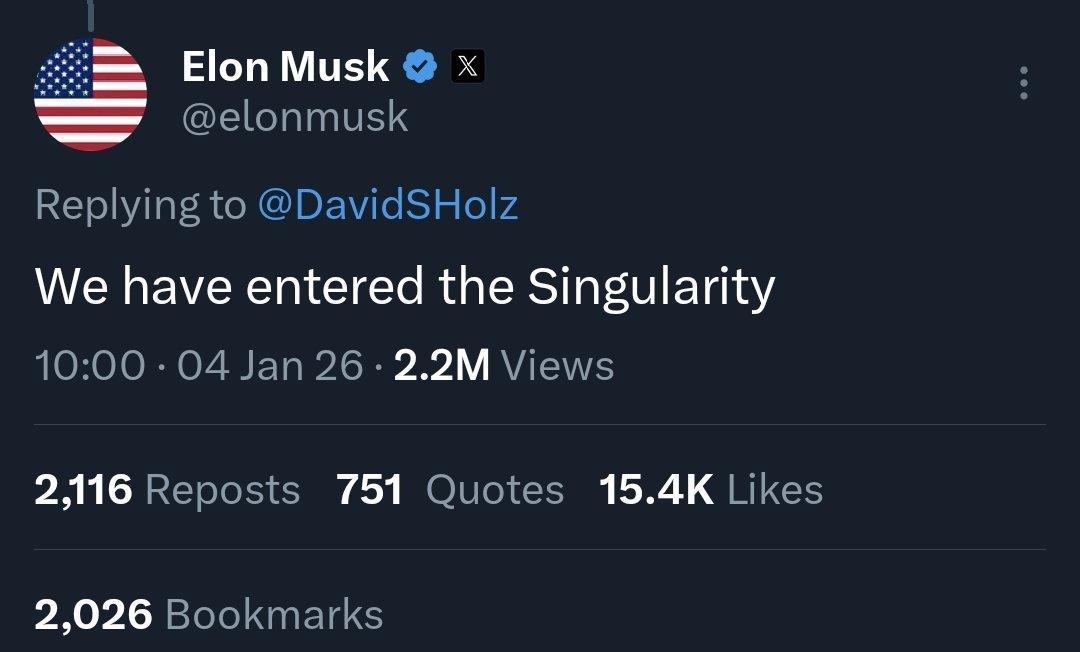 馬斯克今年年初就說過,我們已經進入了奇點 | X截圖