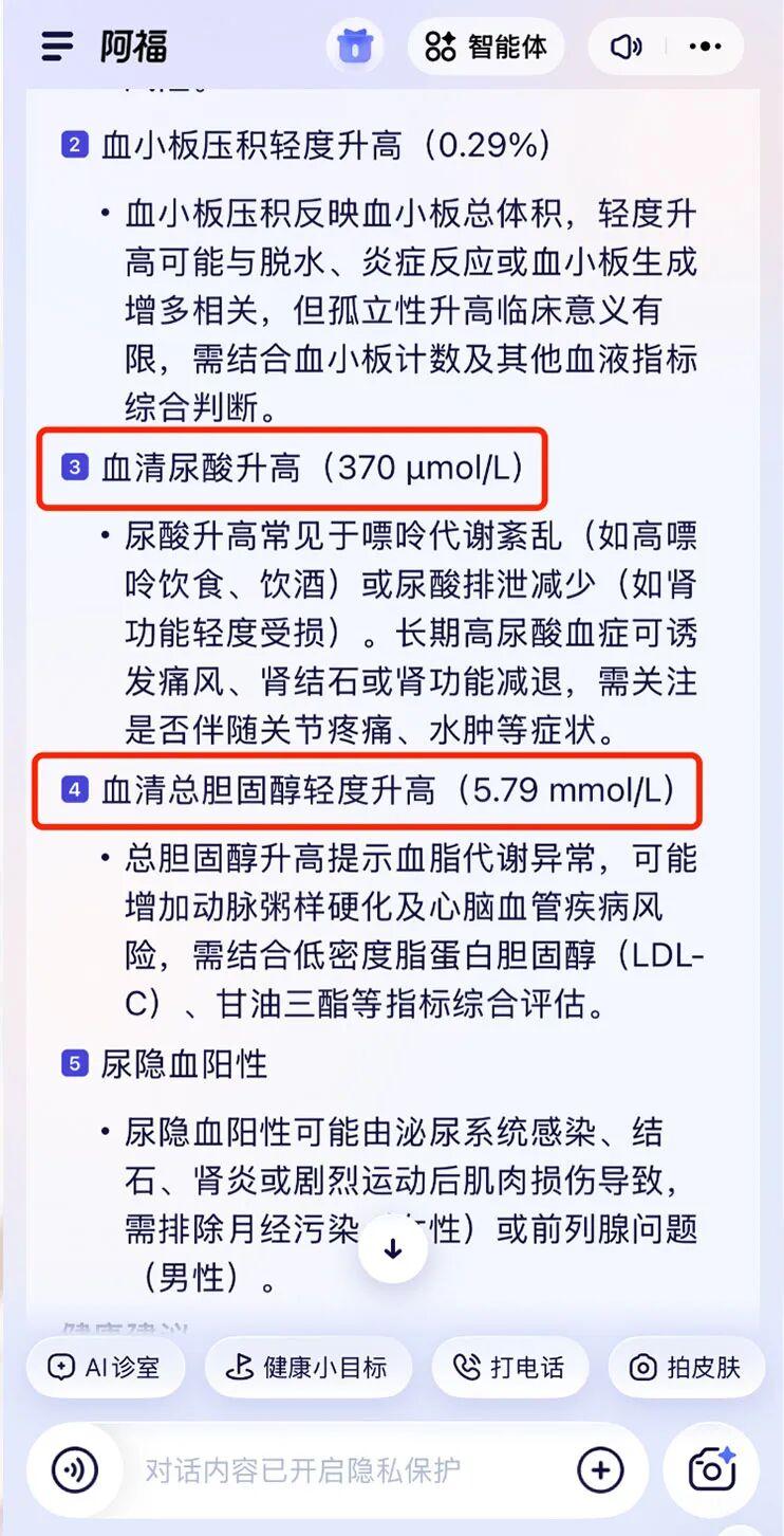 操作簡單到出乎意料:我按順序拍下報告的關鍵頁面,阿福幾乎在上傳完成的瞬間就完成了識別。它沒有像傳統應用那樣簡單地羅列數據,而是像一個經驗豐富的助手,直接從那些標紅的異常指標入手,進行綜合分析。