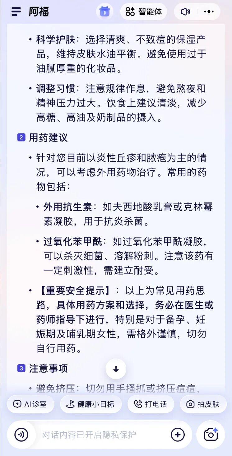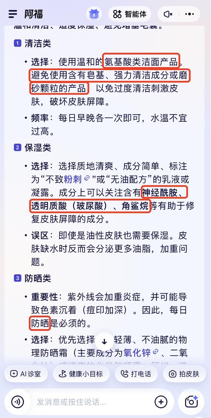 值得一提的是,在皮膚問題應對的建議部分,阿福有時會提示可選用的成分,但不會推薦具體品牌或產品。這種做法既保持了客觀性,又給予了用戶自主選擇的空間。