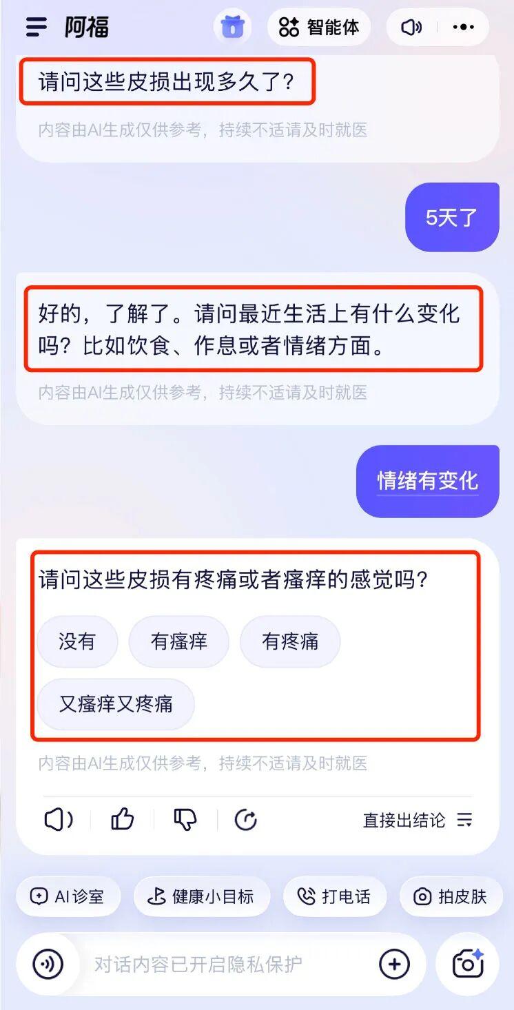 緊接着,阿福沒有立刻“診斷”,而是像一位耐心的醫生開始追問:“這種情況出現多久了?”“近期飲食作息如何?”“有沒有瘙癢或疼痛?”——這幾輪互動下來,它蒐集的信息越具體,後續的判斷和建議也顯然更有針對性。