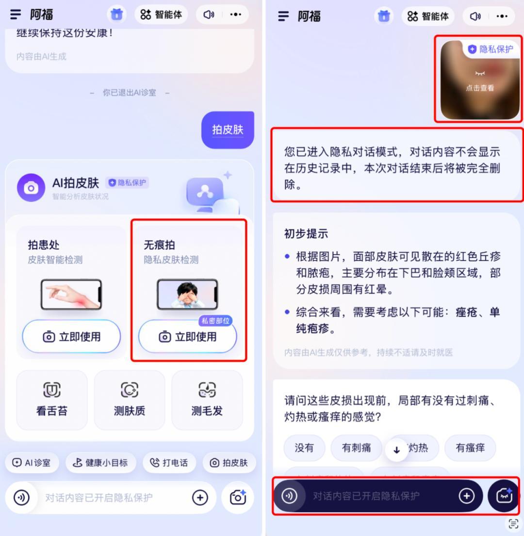 我們注意到,對於更在意隱私的人,可以專門開啓“無痕拍”模式,對話結束後所有記錄自動清除,這種設計尤其適合拍攝一些私密部位的皮膚問題。整個流程幾乎無需學習,長輩也能輕鬆操作。