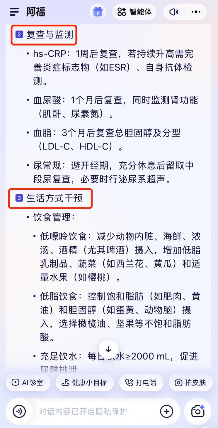 更關鍵的是每項解讀後配套的“生活建議”。針對尿酸、血脂升高,它不僅解釋成因,還會給出相對具體、可執行的方向,比如控制動物內臟和酒精攝入、逐步減重、增加運動,並提示“建議3個月後複查血尿酸、總膽固醇及分型,仍未達標建議就醫”。這種從“閱讀報告”到“分析下一步怎麼做”的銜接,讓體檢結果真正變成可操作的健康管理參考。