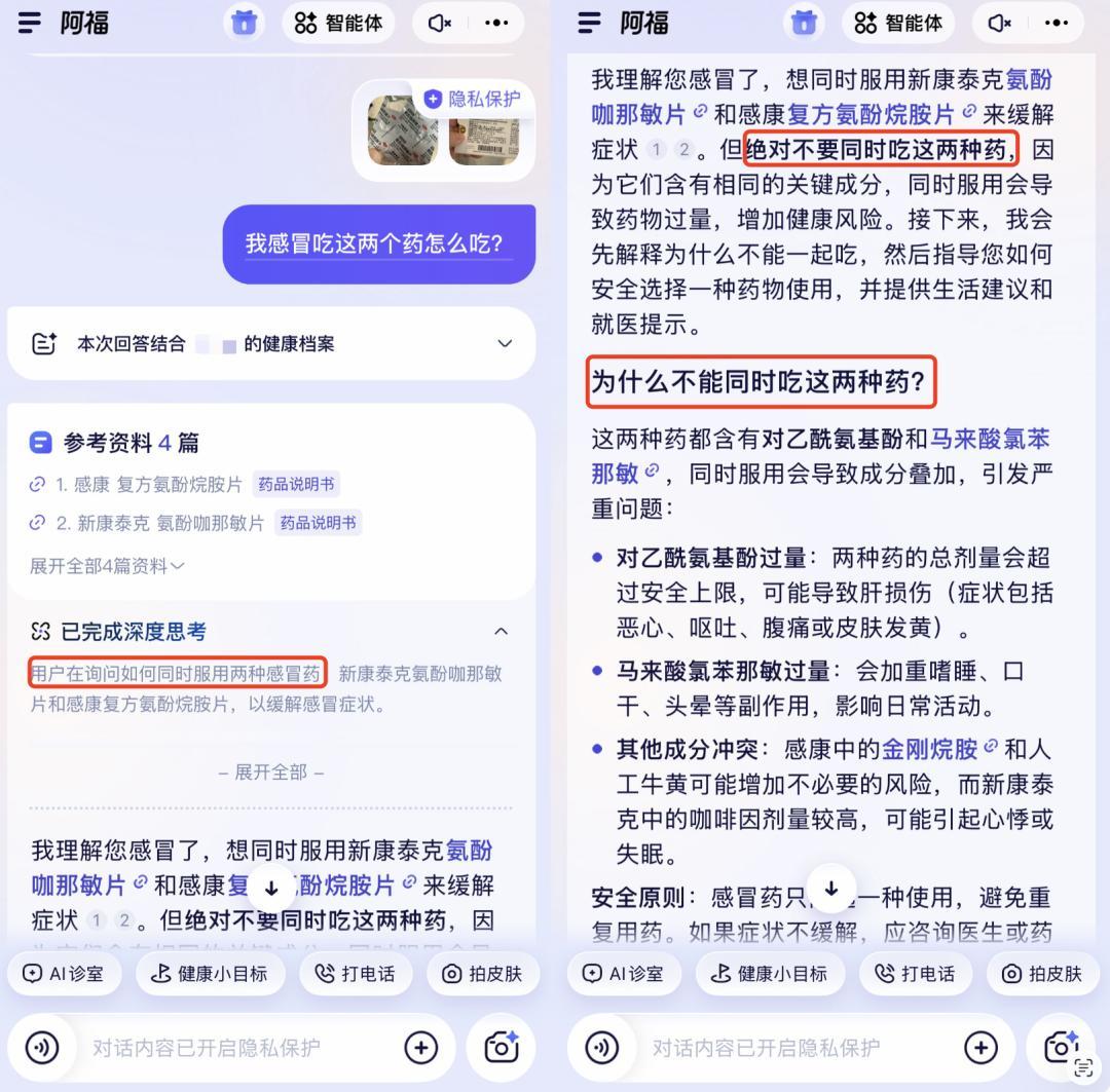最讓人安心的是它的“防錯”設計。比如當我同時拍攝兩種感冒藥時,阿福會主動提示“這兩種藥物含有相同成分,同時服用可能導致過量,建議選擇其中一種”。