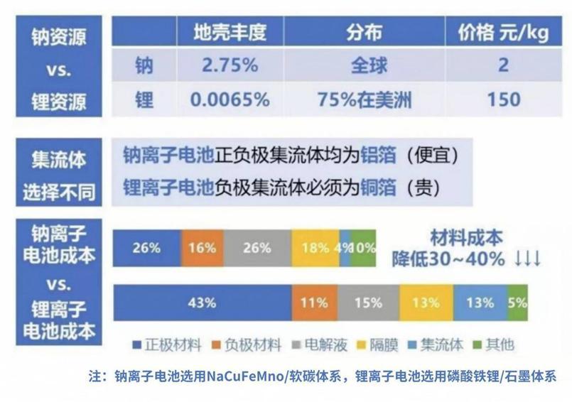 相較於鋰,鈉在地殼中具有更高的丰度,成本優勢顯著,且鈉電的綜合性能與鋰電最爲接近、鈉離子電池的架構、封裝工藝與鋰電池高度相似,中長期較鋰電池均有一定的成本優勢,使得鈉電池成爲近年來備受關注的新型能源存儲技術。