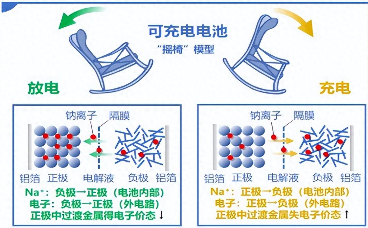鈉電池,即鈉離子電池(sodium-ion battery,常縮寫爲SIB或Na‑ion Battery),是一種可逆充放電的“搖椅式”二次電池體系。其工作原理是依賴鈉離子(Na⁺)在正極與負極間的嵌入與脫嵌,實現電能的儲存與釋放。鈉電池的核心結構與鋰離子電池高度相似,僅用鈉替代鋰。