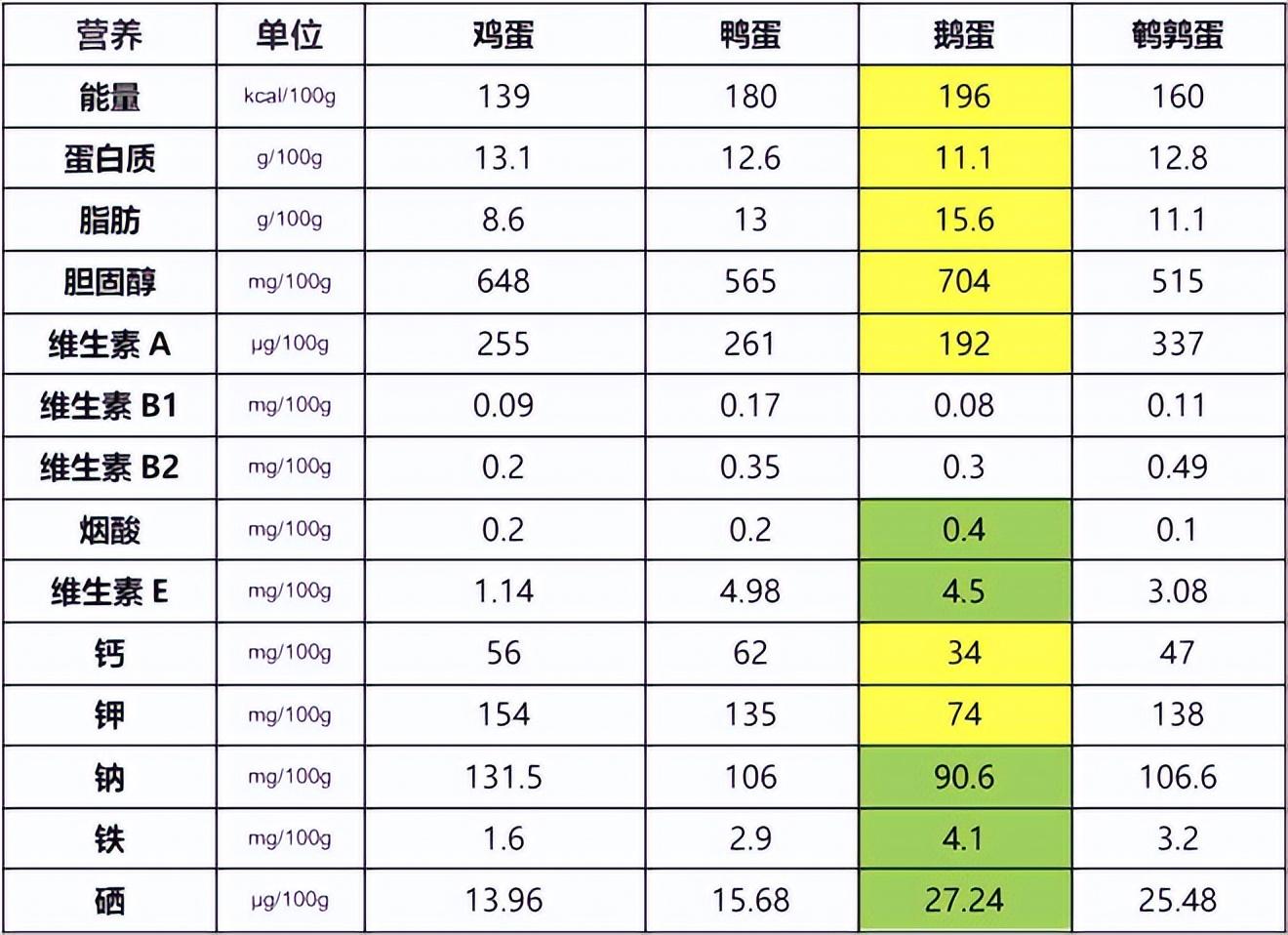 咱們先來看看,鵝蛋和其他蛋類比,營養是不是更有優勢呢?