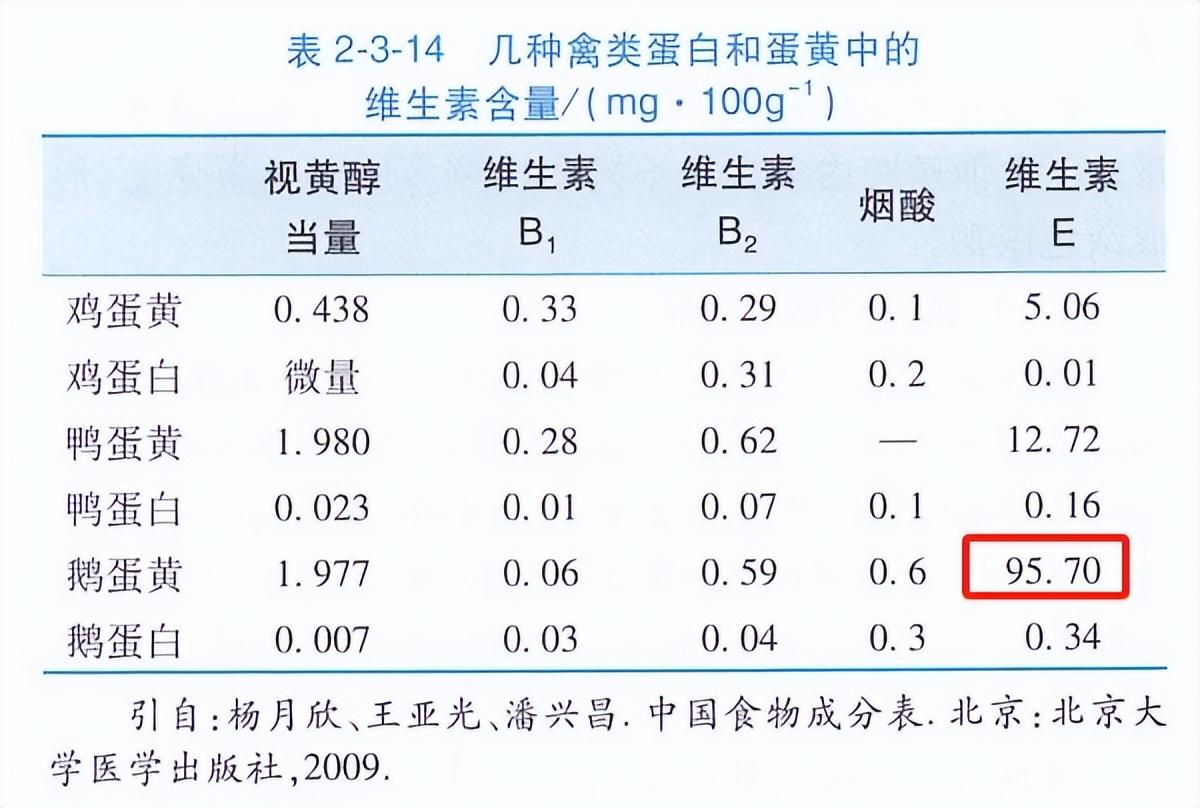 鵝蛋整體的維生素 E 雖然不算高,但蛋黃中的含量爆表,每 100 克含有 95.7mg,遠高於雞蛋黃和鴨蛋黃。