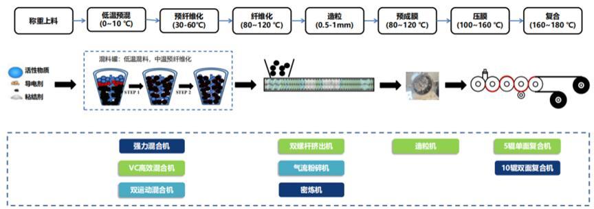 幹法塗布是鋰電池製造的前沿工藝,通過物理混合-原纖化-壓延三步替代傳統溼法塗布工藝,具體流程如下: