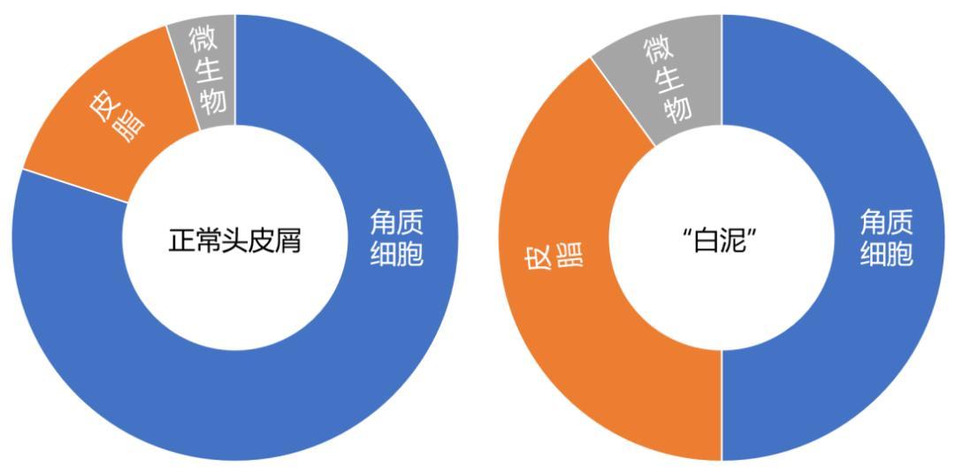 然而,在油脂分泌旺盛或清潔不及時的異常情況下,皮脂和微生物代謝產物大幅增加。當二者之和佔比超過 40% 時,則會出現粘性油膩的頭皮屑,也就是我們通俗說的“白泥”。