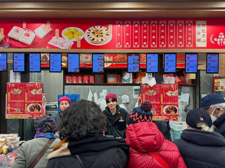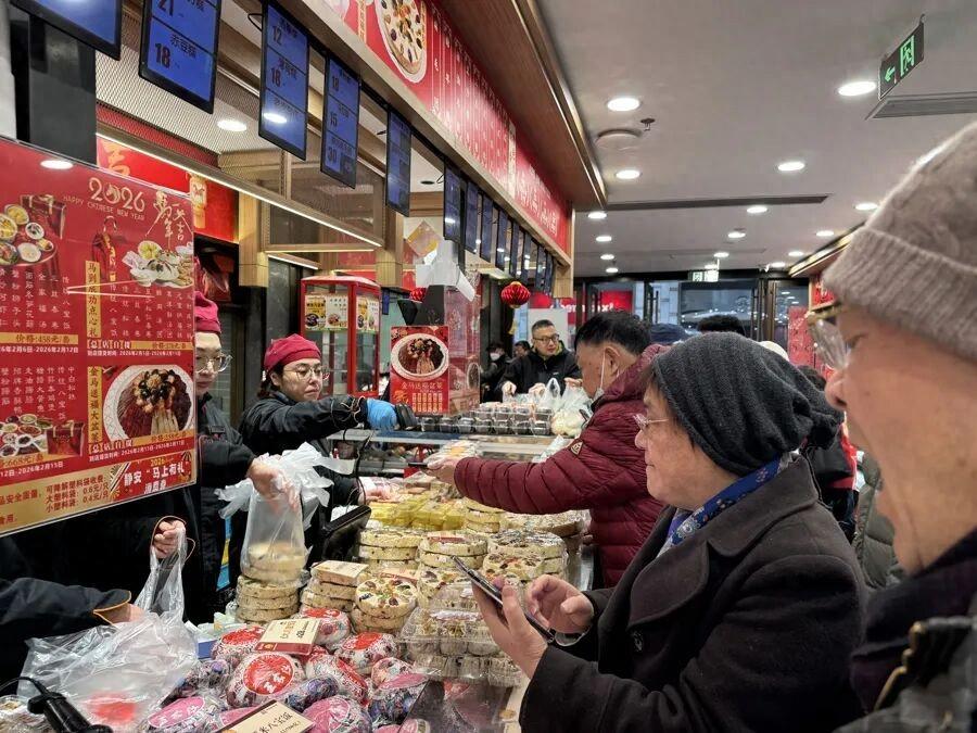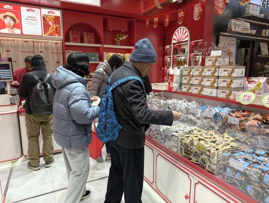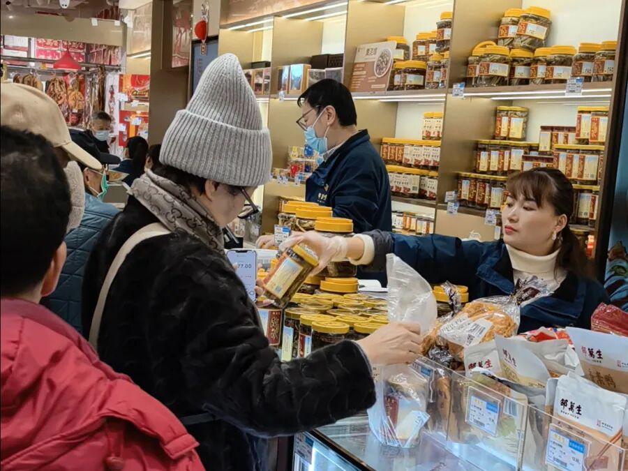南京東路步行街上,銀髮族也是年貨消費的主力軍。泰康、新雅、第一食品商店、沈大成、三陽南貨店、邵萬生等老字號中,人頭攢動,人均客單價都不低。