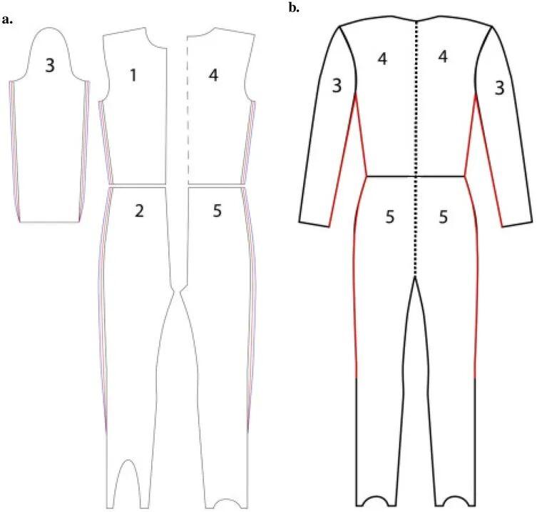 跳臺滑雪服的構造示意圖。比賽服的尺寸有非常嚴格的規定,比如說在任何部位衣服的周長都只能比身體周長多4釐米以內。| Mikko Virmavirta et al.