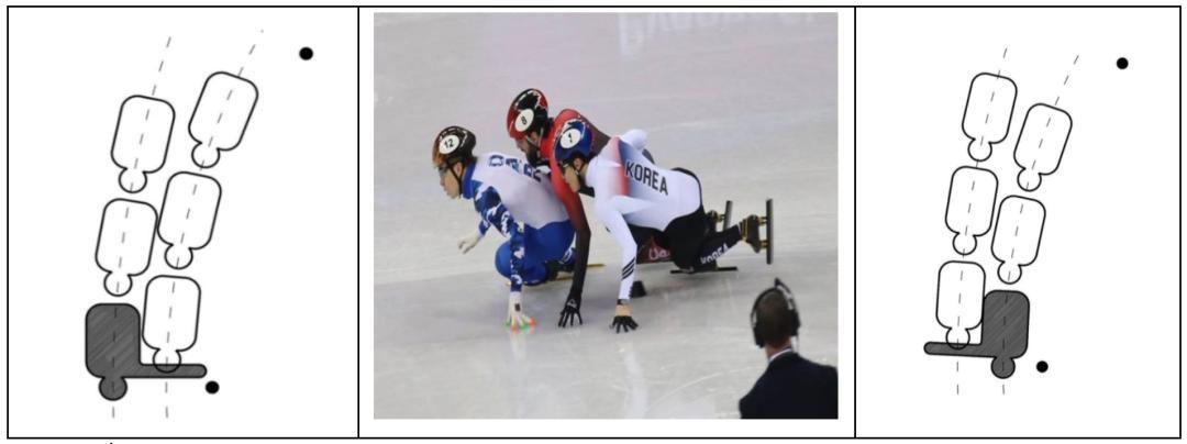 至於“變道”,這在直道是被允許的,但前提是足夠領先,具體標準是變道運動員的臀部必須位於另一運動員肩膀的前方。如果領先沒有這麼多,而是在並行時強行把別人擠走,就可能受到判罰。