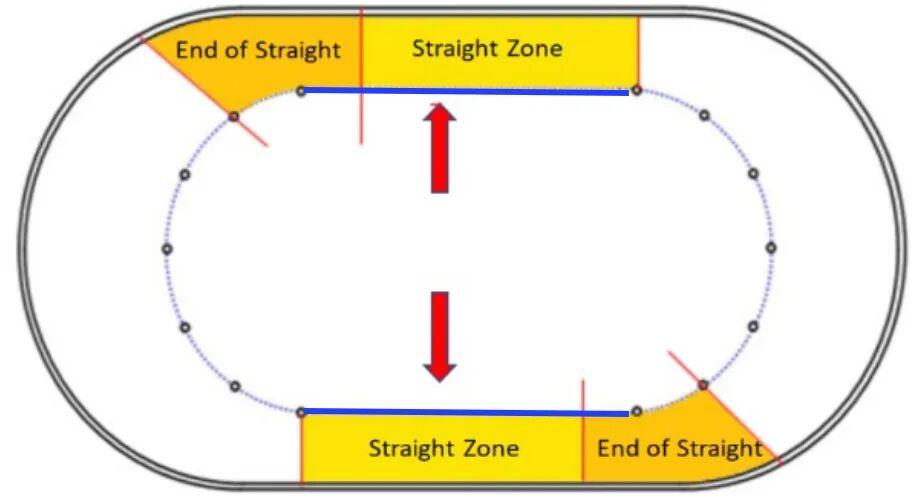 直道(straight),從彎道的最後一個橡膠標誌塊開始,到下一個彎道的第二個標誌塊,賽道剩餘部分稱爲彎道(corner)。在直道發生的犯規代碼爲S1-S9,彎道爲C1-C5 | 參考文獻[1]