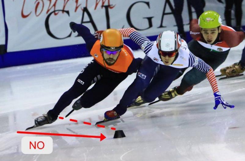 不過,到了轉彎處,運動員必須滑到標誌塊外側,不然就“抄近道”了,會被判脫離賽道。如果兩人並肩滑在藍線內外兩側,接近彎道時,內側運動員爲了繞過標誌塊,向外滑時碰到了外側運動員,內側運動員可能受罰。