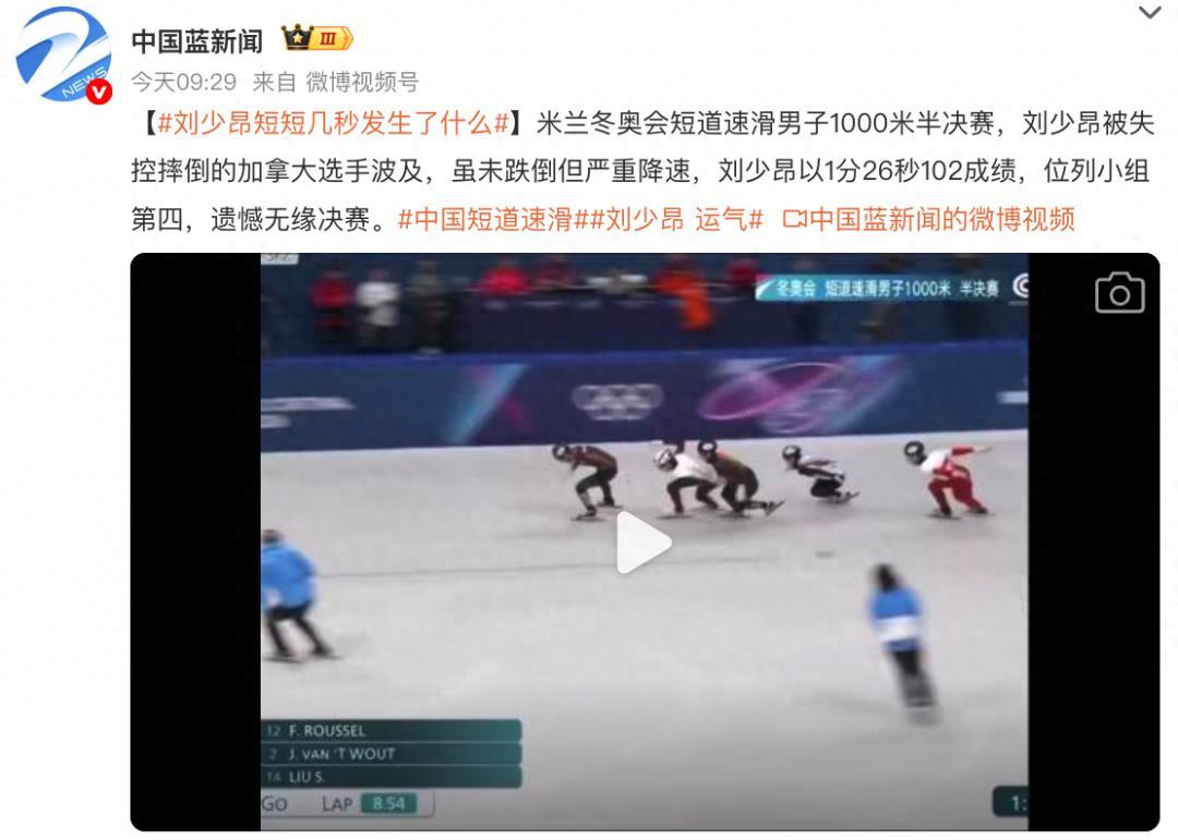 賽後,除了對孫龍的祝賀,半決賽中的一幕也衝上了熱搜:劉少昂短短几秒發生了什麼。賽道上,中國選手劉少昂被加拿大選手的摔倒波及,降速後以第四名衝線,遺憾無緣決賽。