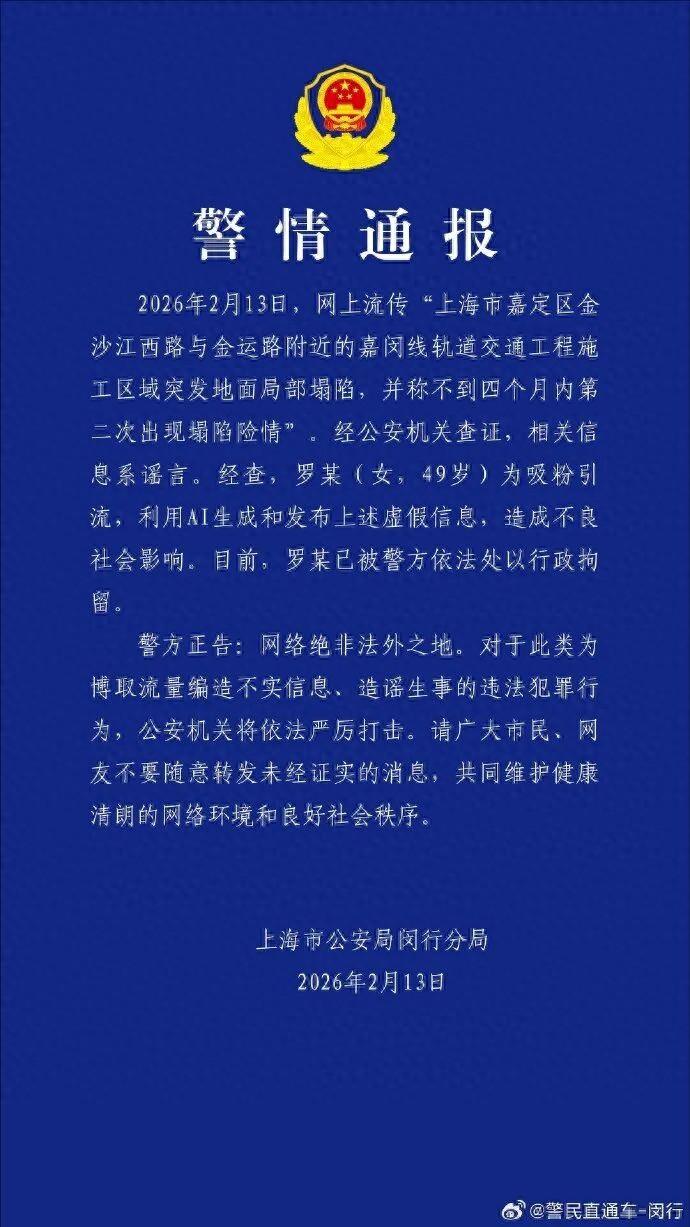 2026年2月13日,網上流傳“上海市嘉定區金沙江西路與金運路附近的嘉閔線軌道交通工程施工區域突發地面局部塌陷,並稱不到四個月內第二次出現塌陷險情”。經公安機關查證,相關信息系謠言。經查,羅某(女,49歲)爲吸粉引流,利用AI生成和發佈上述虛假信息,造成不良社會影響。目前,羅某已被警方依法處以行政拘留。