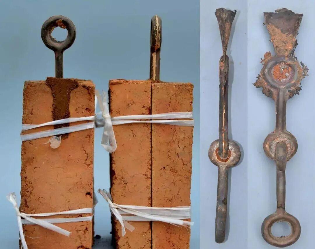 簡單來說,先鑄造好其中一節銅杆,然後把它的一端卡入做另一節銅杆的陶製模具中;爲了防止兩個銅杆被鑄成一體,在注入銅水前,需要在成型的圓環上裹一層泥巴,而泥巴的厚度就是兩個圓環間的活動距離。許多古代青銅器上的套環結構都是這樣分鑄而成的。