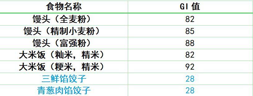 和米麪饅頭等其他主食相比,餃子包裹了富含蛋白質的肉和富含膳食纖維的蔬菜,會顯著降低整體的消化吸收速度,是一類低 GI (血糖生成指數)食物。有數據顯示,三鮮餡餃子和青蔥肉餡餃子的 GI 值都只有 28。[1、2]
