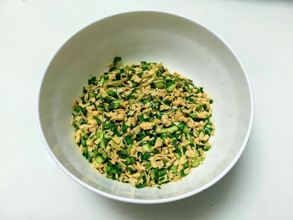無論是肉餡還是素餡,都加上一些切碎的豆製品,比如干豆腐、大豆腐、豆乾等。