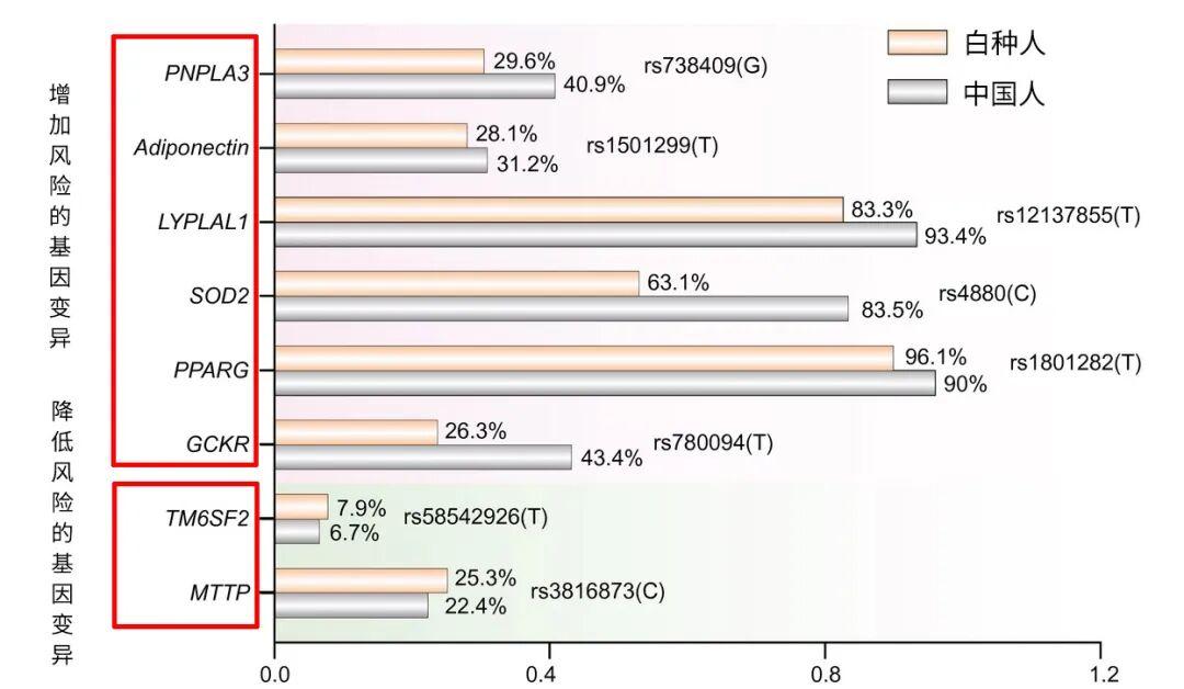 此外與白種人相比,一些與脂肪和糖類代謝相關的基因,其“壞版本”在中國人羣中出現頻率較高。比如PNPLA3基因的某個變異(rs738409:G)在中國更常見,而這種變異會限制分解脂肪的酶的活性,與肝臟脂肪含量升高密切相關;而一些能降低非酒精性脂肪性肝病患病風險的基因變異(如TM6SF2的“好版本”),在中國人羣中反而少見。