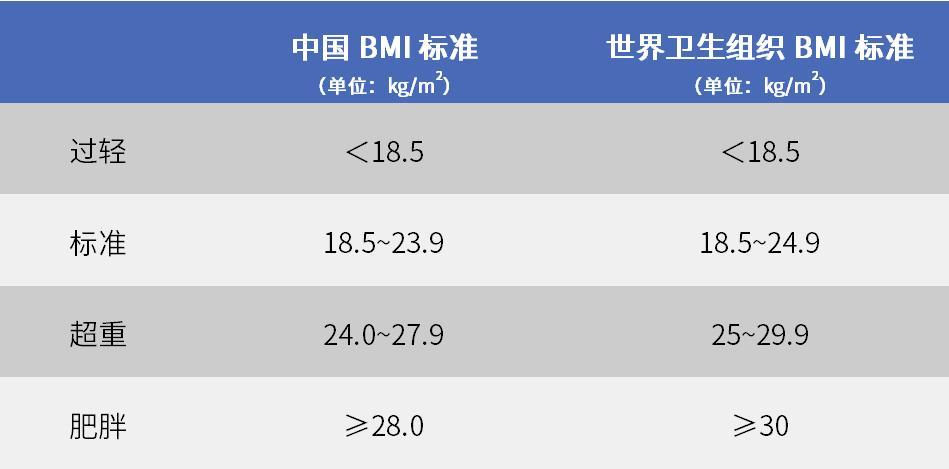 目前,衡量超重和肥胖程度最常用的指標是身體質量指數(BMI)。它的計算方式是“體重(千克)÷身高(米)的平方”。對於我國成年人來說,BMI(單位:kg/m2)的參考值如下——