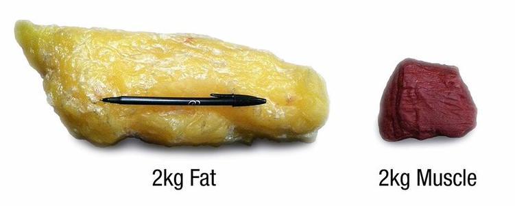 (圖片僅爲示意,不代表真實體積對比)平均而言,哺乳動物肌肉的密度約爲1.1kg/L,脂肪的密度約爲0.9kg/L,同等重量下,肌肉體積更小。丨X@tanay_mandowara
