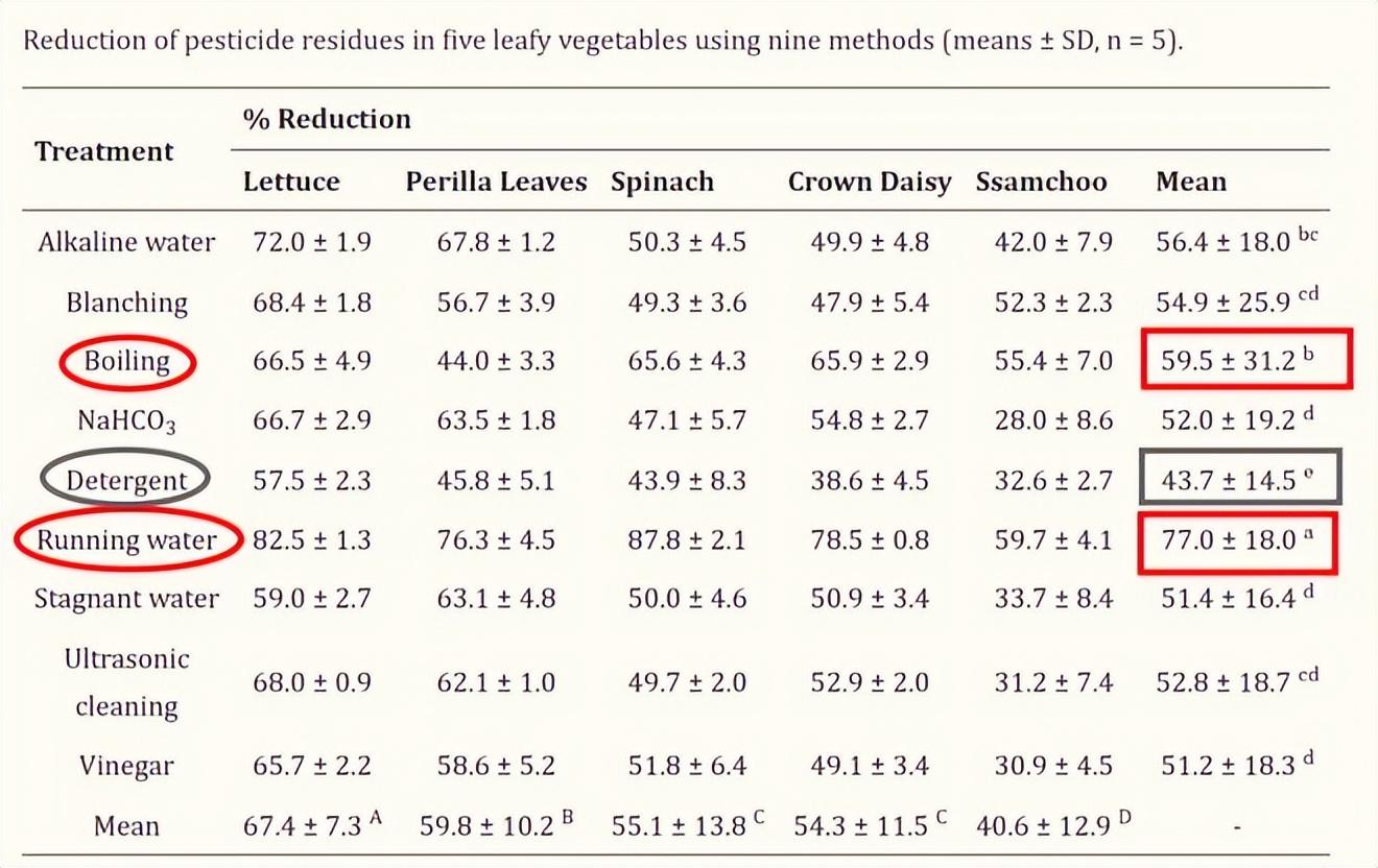 有研究人員針對葉菜類進行不同清洗方式的效果對比。通過對不同葉菜的農殘去除率來看,用流水沖洗(77.0 ± 18.0%)是農殘去除率最有效的手段。而洗滌劑(43.7 ± 14.5%)農殘的減少量最低,效果最差。