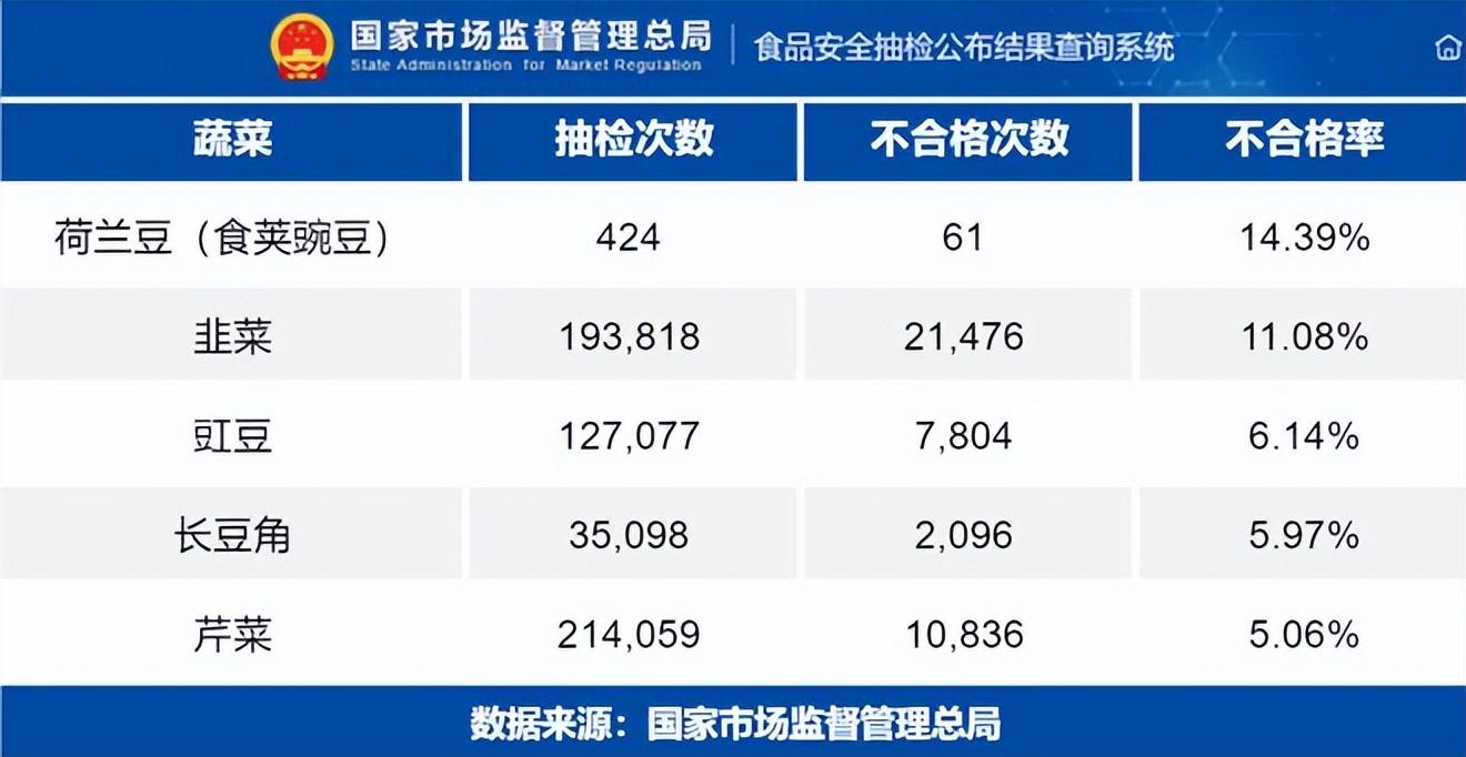 根據國家市場監督管理總局食品安全抽檢公佈結果查詢系統,自 2014 年至今各種蔬菜的抽檢結果,農殘率較高的食物分別是: