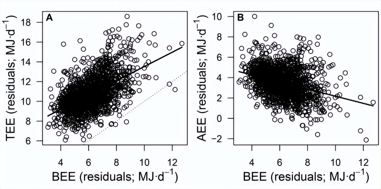 具體的補償情況是什麼樣的呢?據這項研究,研究團隊利用了迄今爲止最大的成人總能量消耗(TEE)和基礎能量消耗(BEE)數據集。研究發現,在沒有進行繁重體力勞動和長期食物短缺的條件下,參與者的總能量消耗(TEE)與基礎能量消耗(BEE)成正比,而日常活動的能量消耗(AEE)卻與基礎能量消耗成反比。
