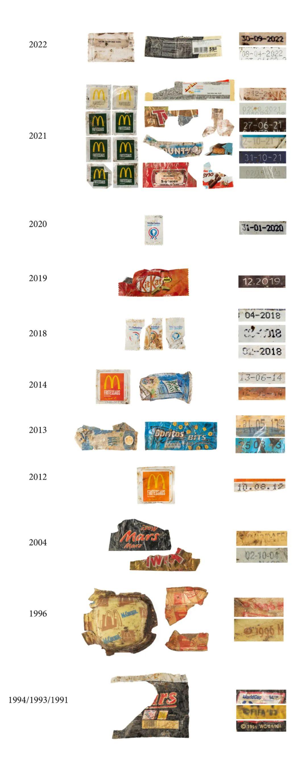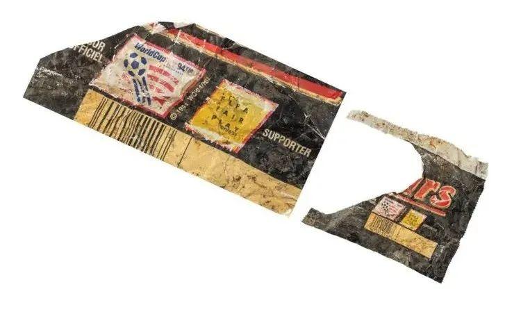 而隨着拆解的深入,研究者發現的垃圾年代變得越來越久遠。在最下層的巢材中,他們甚至發現了30年前的巧克力棒包裝袋,上面還印着1994年世界盃的宣傳廣告。