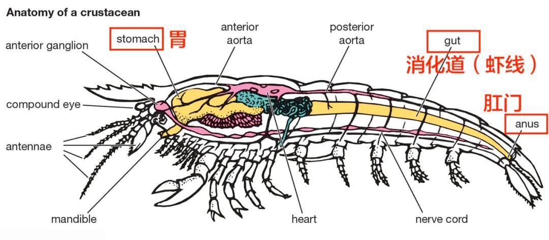 以蝦爲代表的甲殼類解剖示意圖。蝦線本質上是貫穿全身的消化道,食物和泥沙經消化後只能通過肛門排出,並不存在像貝類那樣通過鰓部“吐沙”的生理機制。| Britannica